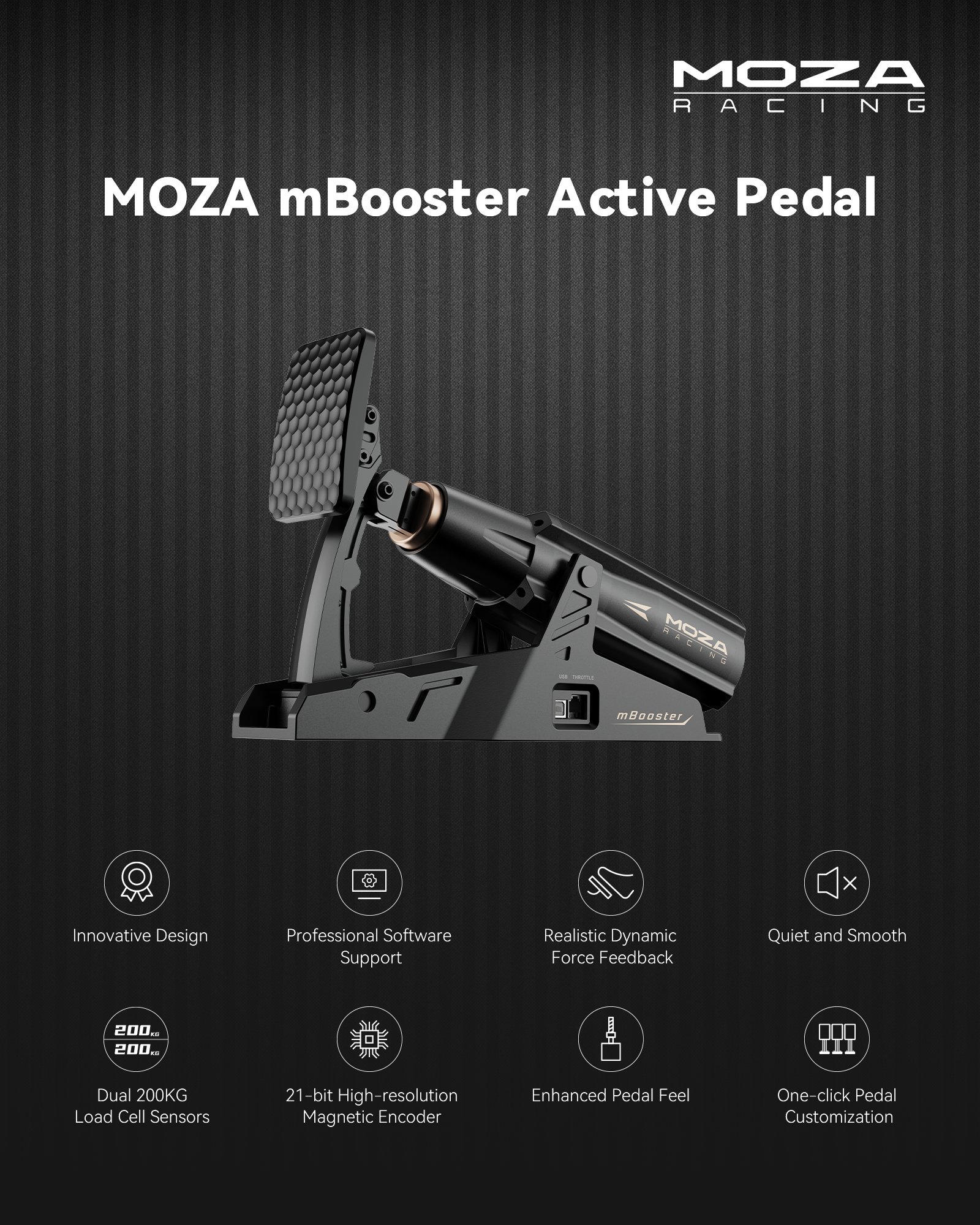 The MOZA mBooster Active Pedal redefines sim racing with realistic dynamic force feedback and precision control. It delivers unparalleled accuracy and responsiveness and features dual 200KG load cell sensors and a 21-bit high-resolution magnetic encoder. The high-torque density motor and MOZA Pit House software enable one-click customization for throttle, brake, or clutch functions. With adjustable pedal feel, real-time ABS, traction control, engine vibration, and G-force feedback, the mBooster ensures an immersive and true-to-life driving experience. Compatible with CRP2 pedals for enhanced performance and seamless integration with MOZA Racing ecosystems.